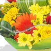 Уменьшенный: роза красная - 3 шт., роза белая - 1 шт., гербера оранжевая/красная - 1 шт., кустовая роза желтая/кремовая - 1 шт., хризантема кустовая желтая - 1 шт., декоративная зелень, упаковка