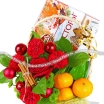 Уменьшенный: гвоздика - 3шт., роза красная - 1шт., хризантема зеленая (сантини) - 1шт., корица, мандарины - 0,5кг., конфеты "Родные просторы" (278 г.) - 1шт., еловая ветвь - 1шт., новогодний декор и зелень, желтый фетр, оазис, корзина малая.