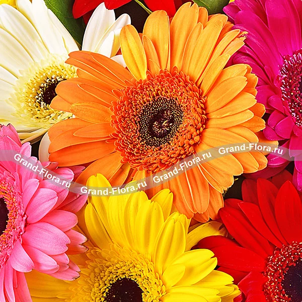 поможет солнечное сочетание пестрых гербер. Нежно розовый цвет намекнет о симпатии,  желтый о дружеском интересе, оранжево-красный станет комплиментом, а насыщенно-розовый